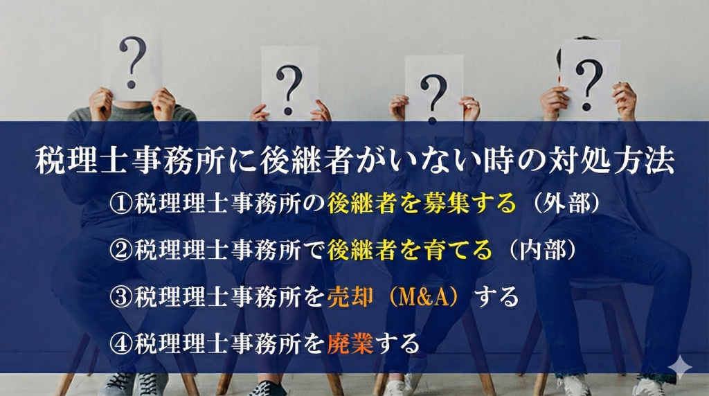 解決方法としては「後継者募集」「内部育成」「M&A」「廃業」の4つがあります。当協会の経験では、時間をかけて育成できる事務所は後継者募集が向いており、時間がない場合や個人への依存リスクを避けたい場合はM&Aが有効です。