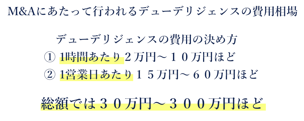 M&A前のデューデリジェンスにはまとまった費用がかかり、総額では300万円ほどになることが多いです。