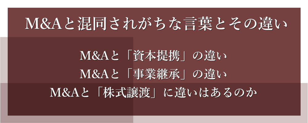 M&Aと意味が似通っている言葉がいくつか存在します。詳しく見てみるとM&Aとの違いが分かったり、M&Aの手法のひとつであったりします。