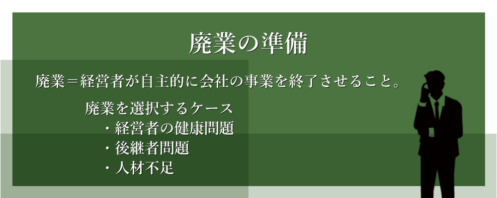 廃業とは経営者が会社の経営を辞退する事です。資金繰りに困っていない状態で、経営者の判断によって廃業を選択することになります。