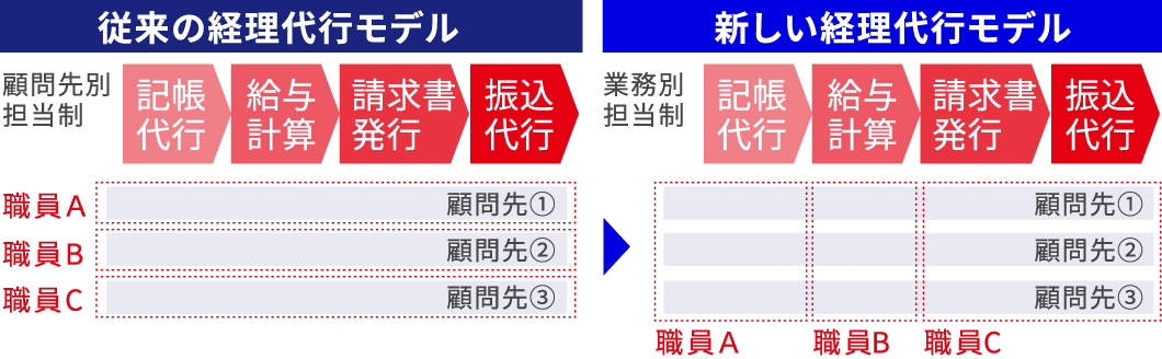顧問先別に担当者を決めるのではなく、業務ごとに担当者を決めることで、担当者は業務に集中することができます。