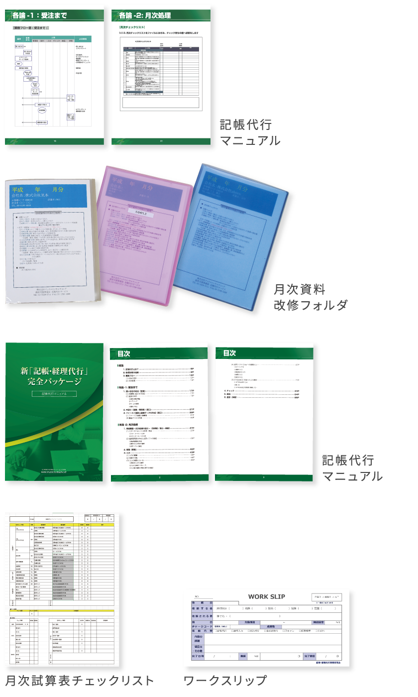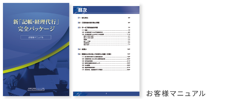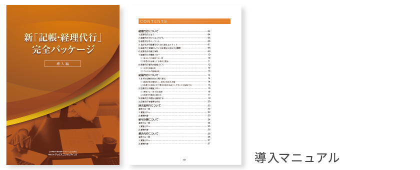 実務がスムーズに行える記帳代行マニュアル、経理代行マニュアルなどをご用意しております。