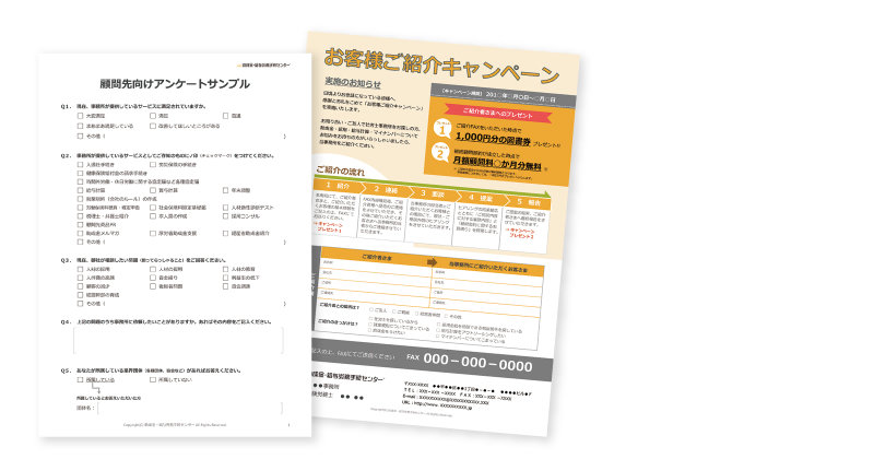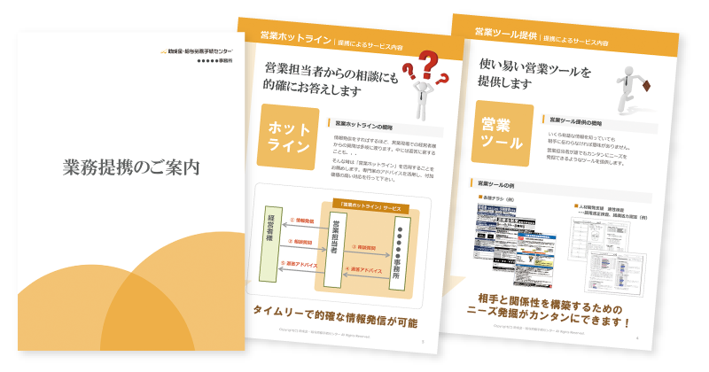 ビジネスパートナー開拓に必要なチラシや提案書が充実。 税理士・保険会社など、相手に合わせた内容で職員でも提案可能に。